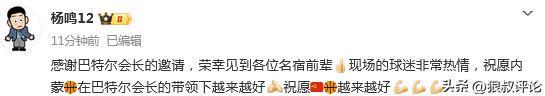 赛后,前辽宁男篮主帅杨鸣更新社媒发文:“感谢巴特尔会长的邀请,荣幸见到各位名宿前辈,现场的球迷非常热情,祝愿内蒙,在巴特尔会长的带领下越来越好,祝愿越来越好。”